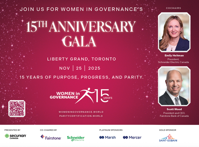 To mark its 15th anniversary, Women in Governance invites you to join us on Tuesday, November 25, 2025, from 5 pm to 9 pm at The Liberty Grand in Toronto for a memorable edition of our Annual Recognition Gala, celebrating inspiration, commitment, and leadership.
